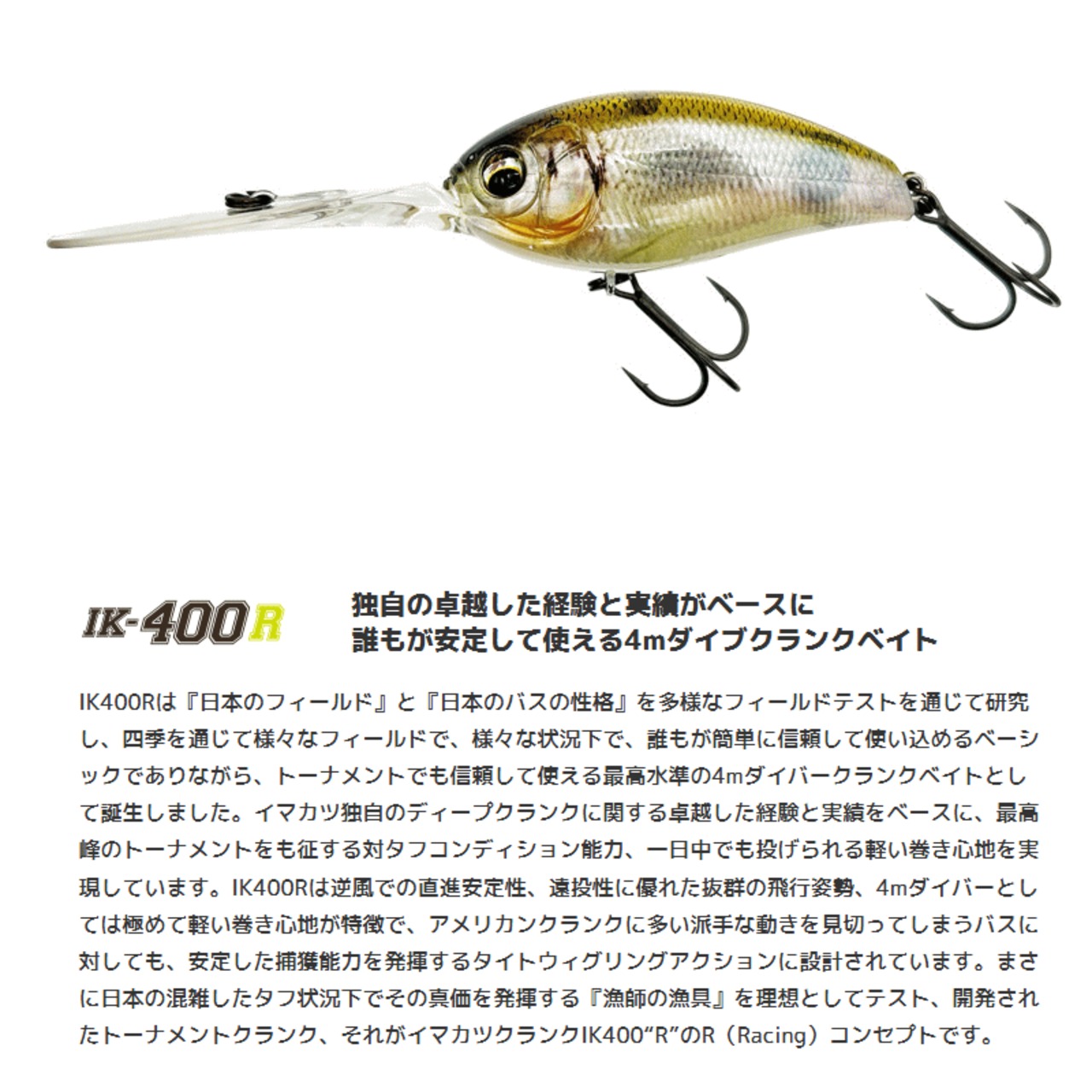 イマカツ独自のディープクランクに関する卓越した経験と実績をベースに、最高峰のトーナメントをも征する対タフコンディション能力、一日中でも投げられる軽い巻き心地を実現しています。IK400Rは逆風での直進安定性、遠投性に優れた抜群の飛行姿勢、4mダイバーとしては極めて軽い巻き心地が特徴で、アメリカンクランクに多い派手な動きを見切ってしまうバスに対しても、安定した捕獲能力を発揮するタイトウィグリングアクションに設計されています。