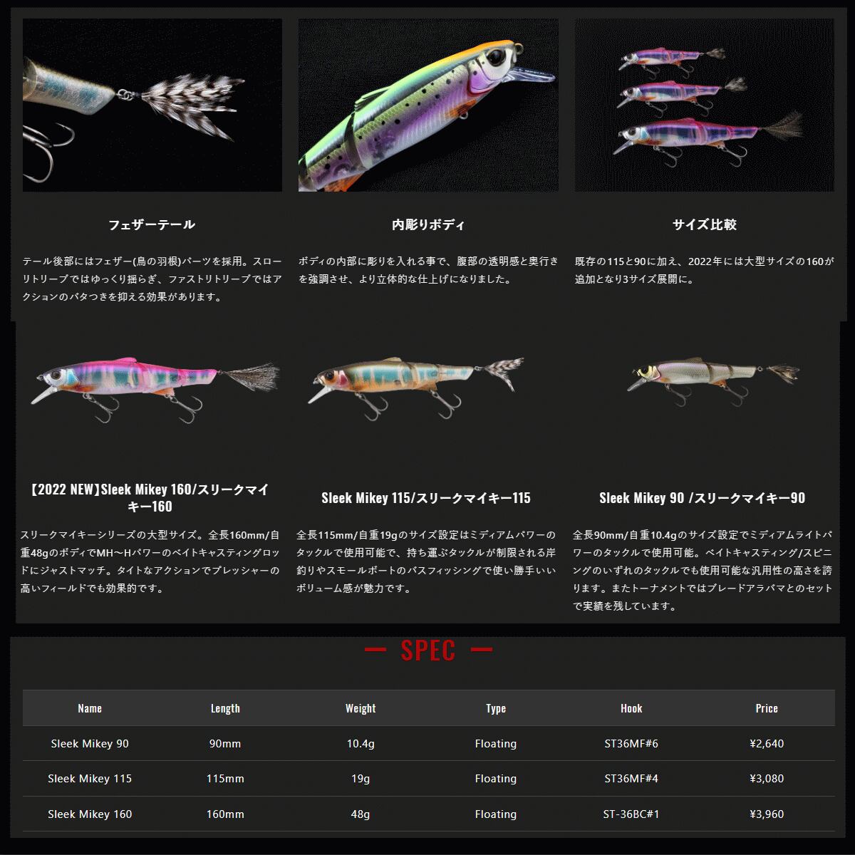 日本の様々なベイトフィッシュサイズに合わせたスリークマイキー。現行の90mm、115mmサイズに新たに加わった160mmサイズの登場により大型ベイトフィッシュパターンもカバーします。