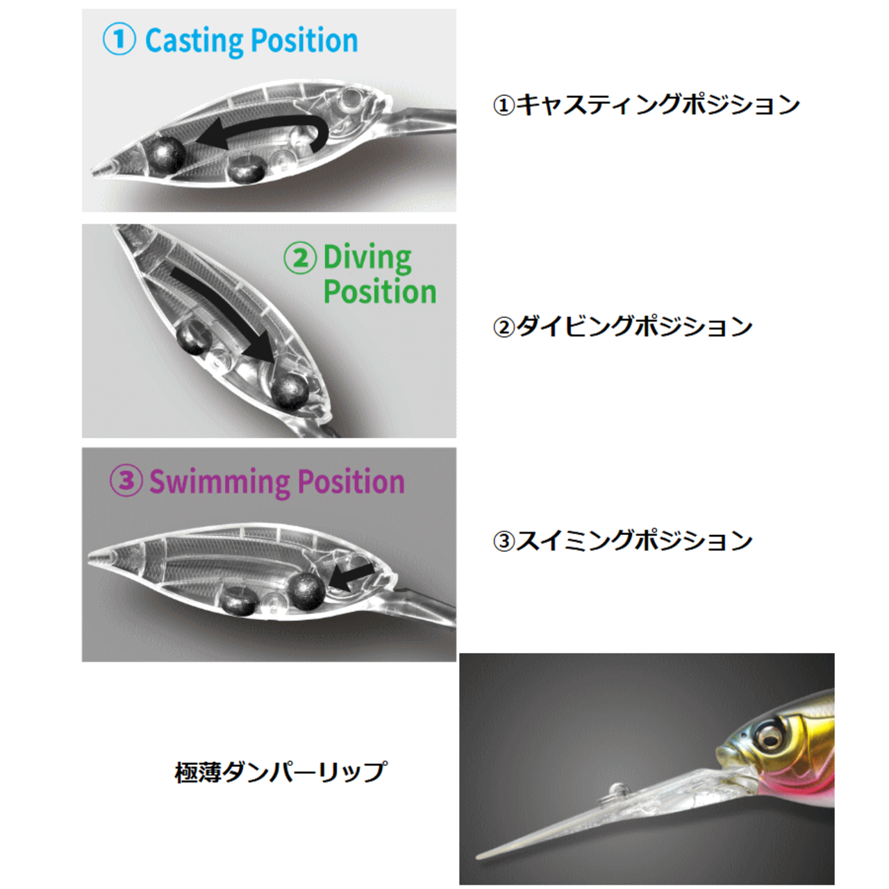 キャスト時はメインウエイトがボディ後方に移動して飛行姿勢を安定化、空気抵抗を低減化させ圧倒的なロングキャスタビリティを発揮。潜行時にはメインウエイトが最前方に移動して急潜行アングルを生み出し、ウォブリングアクションで潜行。最大潜行深度に到達すると、前方固定されていたウエイトがセンターのスイミングポジションに移動し、ハイピッチロールアクションにシフト。