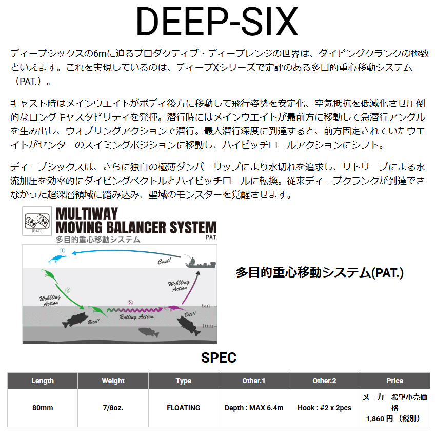ディープシックスの6mに迫るプロダクティブ・ディープレンジの世界は、ダイビングクランクの極致といえます。これを実現しているのは、ディープXシリーズで定評のある多目的重心移動システム(PAT.)。