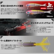 190mm/ 50.5gのオリジナルに対し、新たに加わったJr.サイズは150mm/26.0gとダウンサイジング化したことで、フィールドの状況やエサのサイズに合わせた使い分けが可能になります。