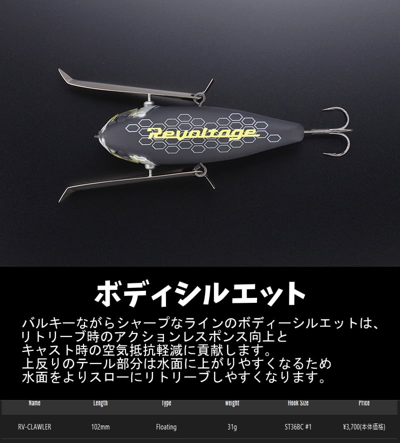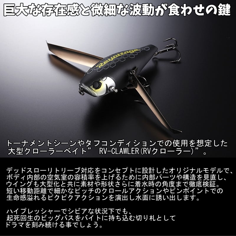 トーナメントシーンやタフコンディションでの使用を想定した大型クローラーベイト” RV-CLAWLER(RVクローラー)”。