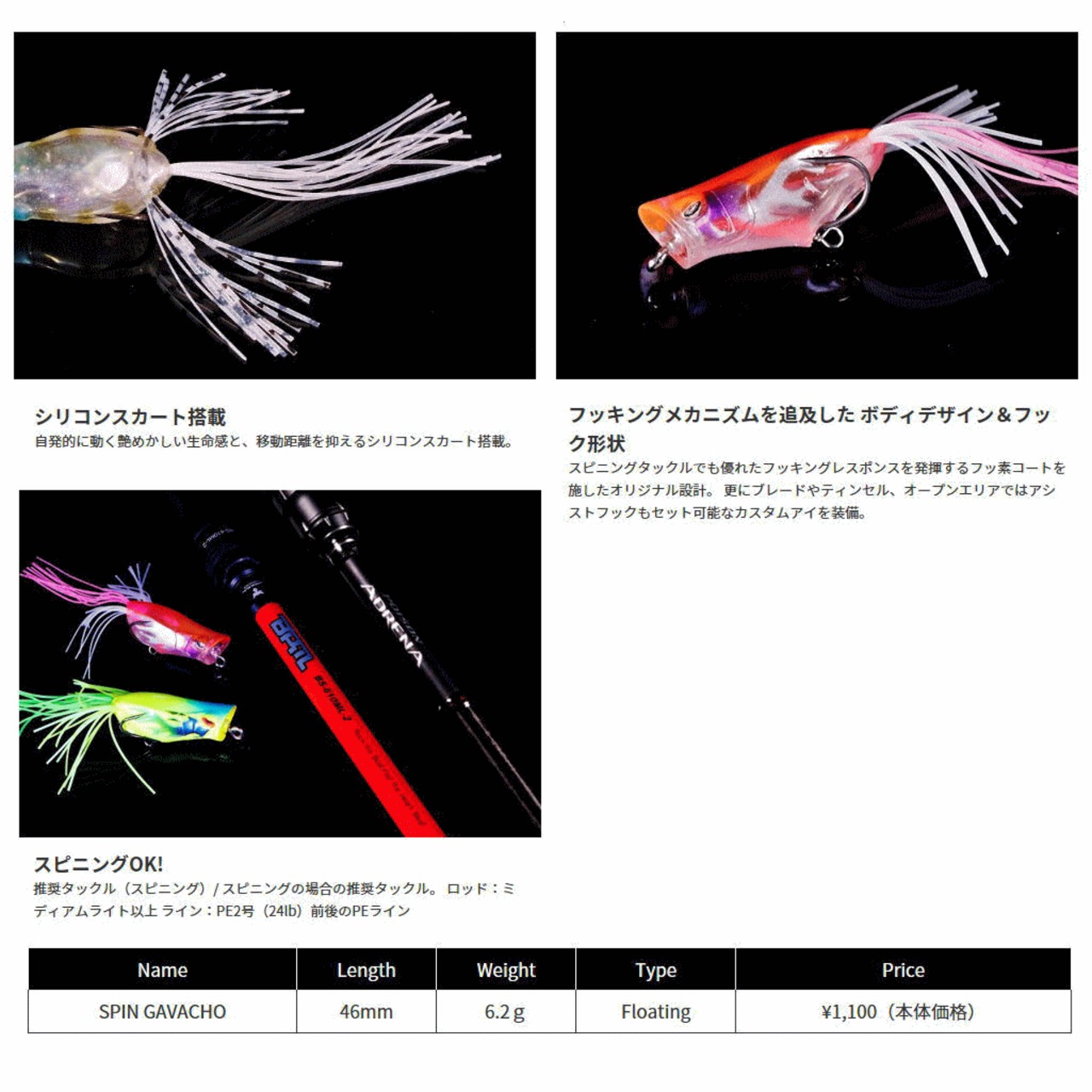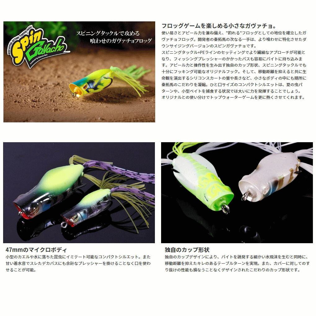 使い易さとアピール力を兼ね備え、"釣れる"フロッグとしての地位を確立したガヴァチョフロッグと、より喰わせに特化させたダウンサイジングモデルのスピンガヴァチョをラインナップ。ヘビーカバーのパワーフィッシングから虫パターンを意識したパワーフィネスゲームまでをカバーします。