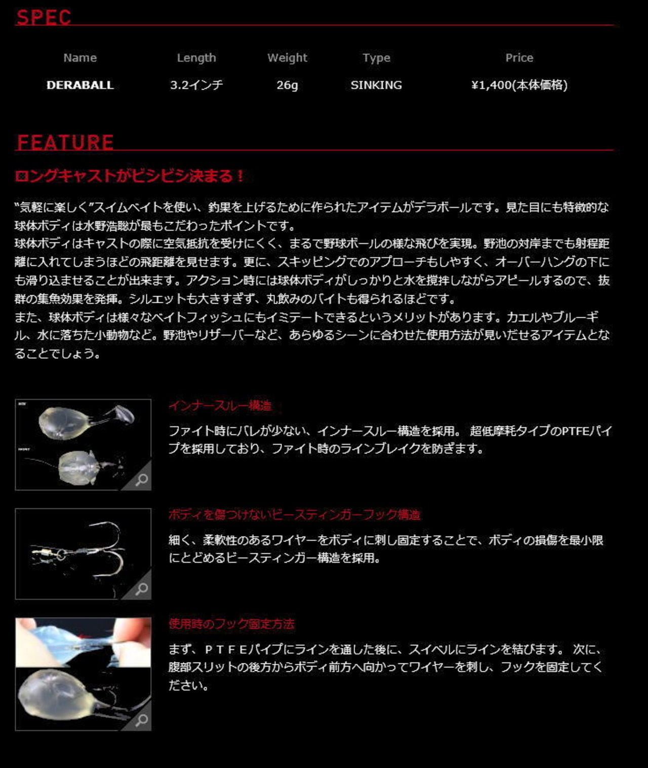 また、球体ボディは様々なベイトフィッシュにもイミテートできるというメリットがあります。カエルやブルーギル、水に落ちた小動物など。野池やリザーバーなど、あらゆるシーンに合わせた使用方法が見いだせるアイテムとなることでしょう。