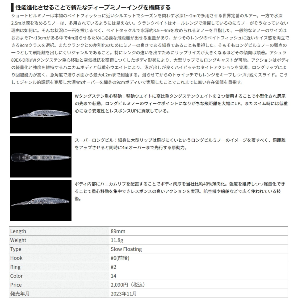 そもそもロングビルミノーの難点の一つとして飛距離を出しにくいジャンルであること。特にレンジの違いを出すためにリップサイズが大きくなるほどその傾向は顕著。アシュラ89EX-DRはWタングステン重心移動と空気抵抗を研鑽しつくしたボディ形状により、大型リップでもロングキャストが可能。アクションはボディの軽量化と強度を維持するハニカムボディと低重心ウエイトにより、泳ぎ出しが良くハイピッチなタイトアクションを実現。