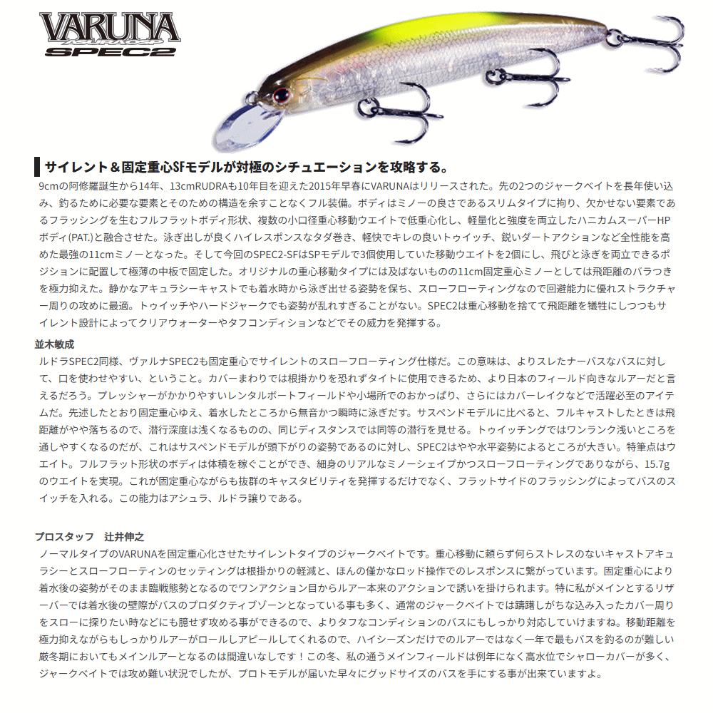 泳ぎ出しが良くハイレスポンスなタダ巻き、軽快でキレの良いトゥイッチ、鋭いダートアクションなど全性能を高めた最強の11cmミノーとなった。