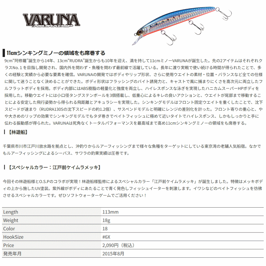9cm“阿修羅”誕生から14年、13cm“RUDRA”誕生からも10年を迎え、満を持して11cmミノーVARUNAが誕生した。先の2アイテムはそれぞれクラスNo.1を目指し開発され、国内外を問わず・魚種を問わず最前線で活躍している。長年に渡り実戦で使い続ける時間が得られたことで、多くの経験と実績から必要な要素を確信。VARUNAの開発ではボディやリップ形状、さらに使用ウエイトの素材・位置・バランスなど全ての仕様に関して迷うことなく決めることができた。ボディ形状はフラッシングのバイト誘発力と、キャストで風に捕まりにくさを高次元に両立したフルフラットボディを採用。ボディ内部にはABS樹脂の軽量化と強度を両立し、ハイレスポンスな泳ぎを実現したハニカムスーパーHPボディを採用した。移動ウエイトには小口径タングステンボールを3個搭載し、低重心によるキレの良いアクションと、ウエイトが尾部まで移動することによる安定した飛行姿勢から得られる飛距離とアキュラシーを実現した。シンキングモデルはフロント固定ウエイトを重くしたことで、沈下スピードが速まり(RUDRA130Sの沈下スピードの約1.2倍)、サスペンドモデルと明確にレンジの差別化を計った。フロント寄りの重心と、やや大きめのリップの効果でシンキングモデルでもタダ巻きでベイトフィッシュに極めて近いタイトでハイレスポンス、しかもしっかりと手に伝わる振動感が得られた。VARUNAは死角なくトータルパフォーマンスを最高域まで高め11cmシンキングミノーの領域をも席巻する。