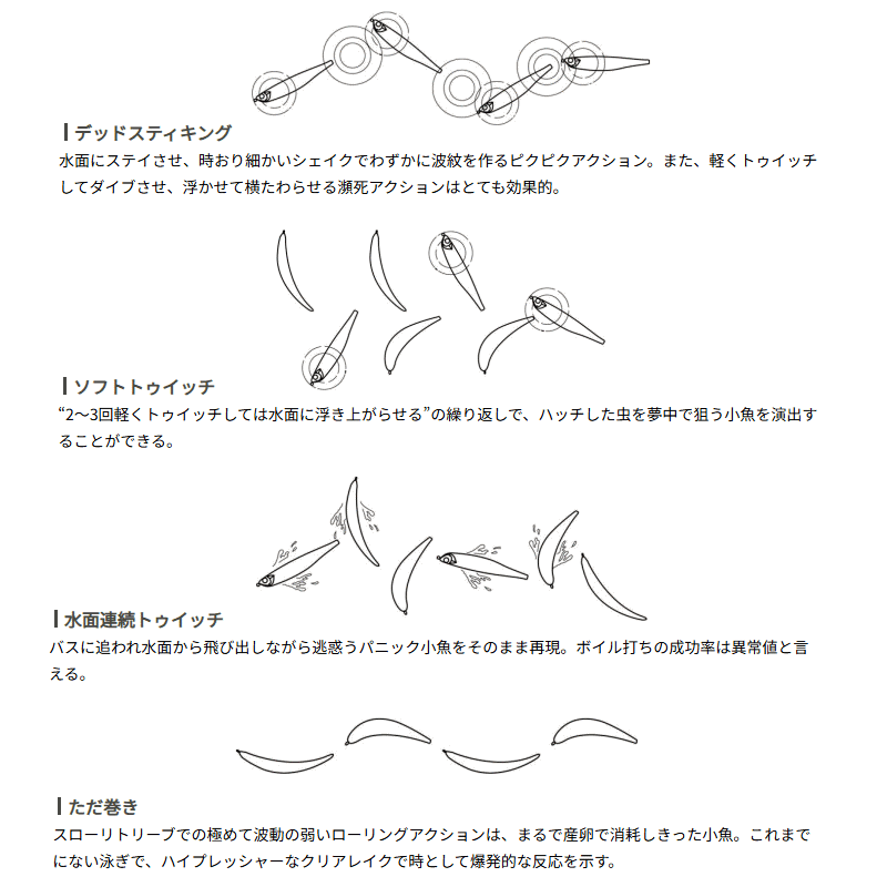 最大の特徴であるベントしたボディは、泳ぐ力を失い水面に横たわる小魚をスーパーリアルに再現。止めているだけでもターゲットの反応が明確に違うことでその効果を証明してくれる。