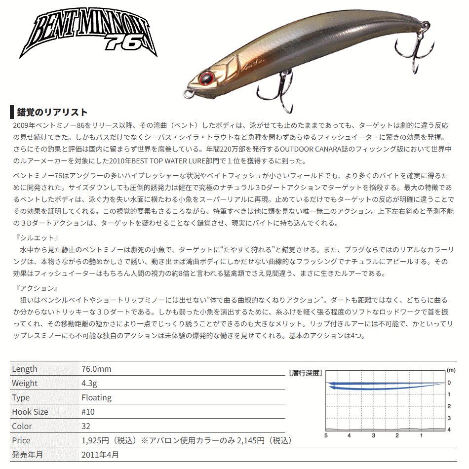 ベントミノー76はアングラーの多いハイプレッシャーな状況やベイトフィッシュが小さいフィールドでも、より多くのバイトを確実に得るために開発された。